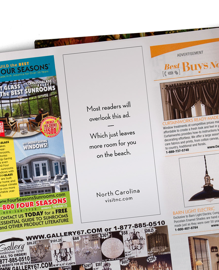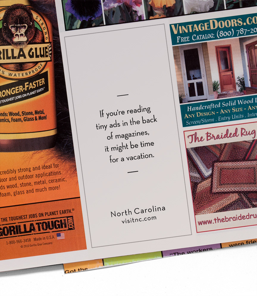 A campaign of very small space ads for North Carolina tourism. Featured in The One Show Advertising Annual.