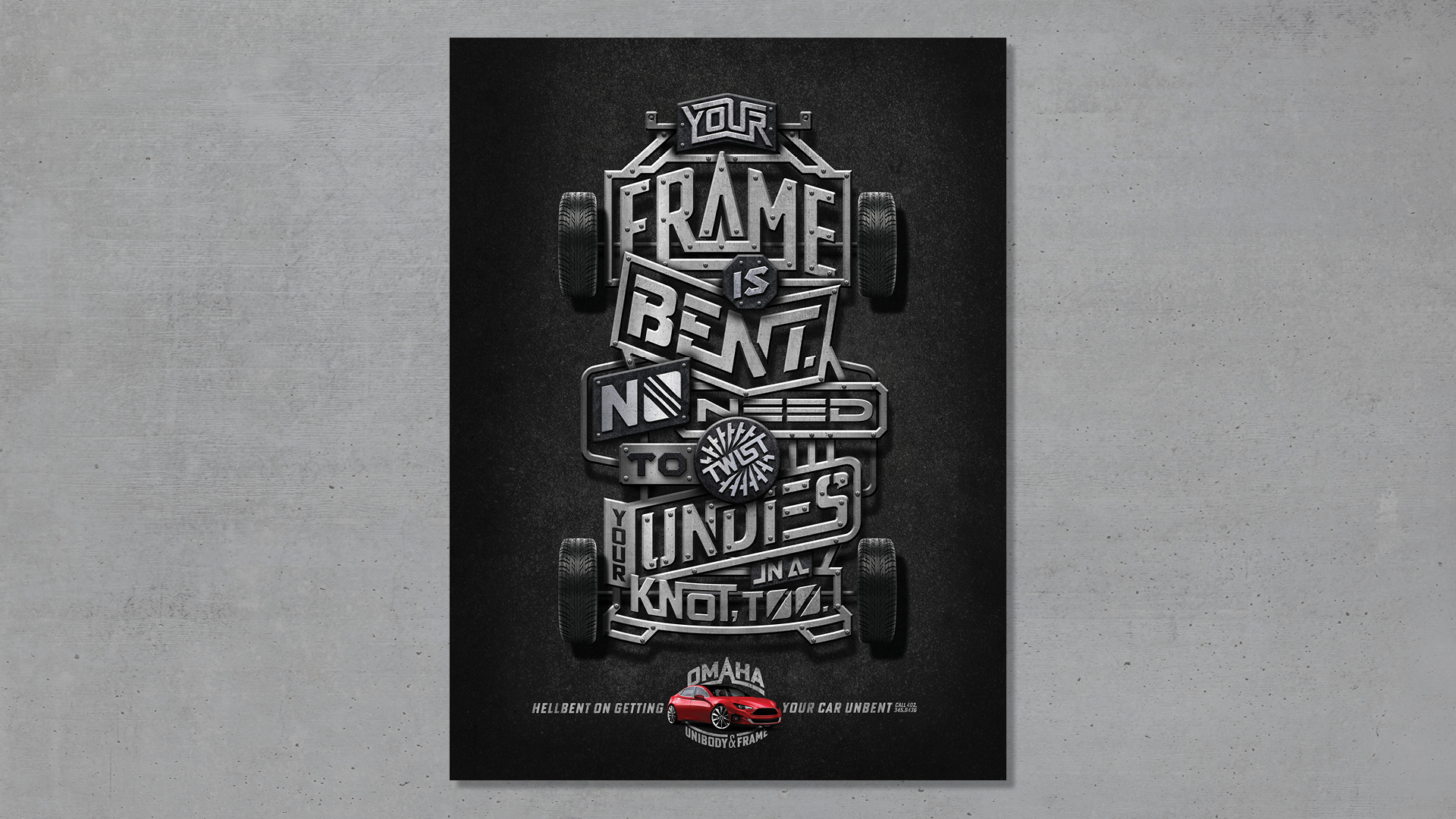 Posters and social posts for Omaha Unibody & Frame - who are hellbent on getting your car unbent.