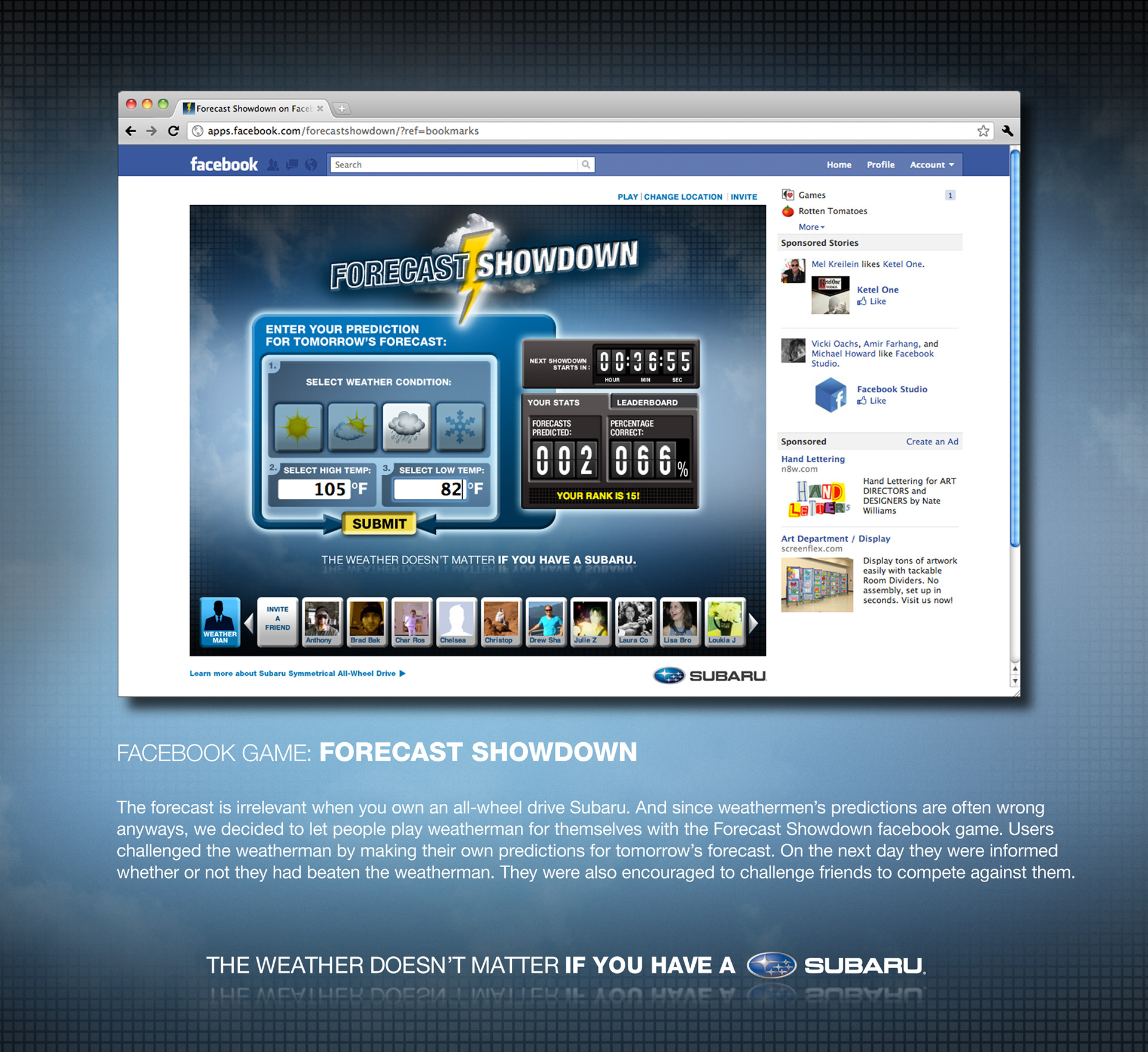 In conjunction with Subaru's "World's Worst Weatherman" campaign we created a Facebook game that allowed users to pit themselves against actual weather forecasts to see who made the most accurate predictions.